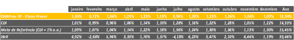 Ao longo de 2025, os investimentos do Plano Prever apresentaram uma recuperação consistente. A rentabilidade do período ficou ligeiramente abaixo do CDI, indicador que acompanha a taxa de juros da economia e serve como principal referência para os investimentos de renda fixa no mercado brasileiro. Ainda assim, o bom desempenho da bolsa brasileira contribuiu para diversificação da carteira da OABPrev-SP, reforçando o compromisso da entidade com a geração de resultados, por meio de uma gestão responsável, focada em resultados consistentes e sustentáveis, sempre alinhados aos objetivos de longo prazo dos participantes.