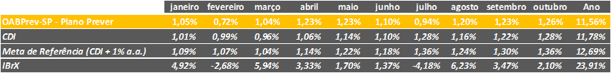 Por fim, o Plano Prever registrou rentabilidade de 1,26% em outubro, impulsionada pelo desempenho dos fundos multimercados e de renda variável, que foram favorecidos pelo ambiente de maior propensão ao risco e pela perspectiva de início do ciclo de cortes da taxa de juros a partir de 2026.